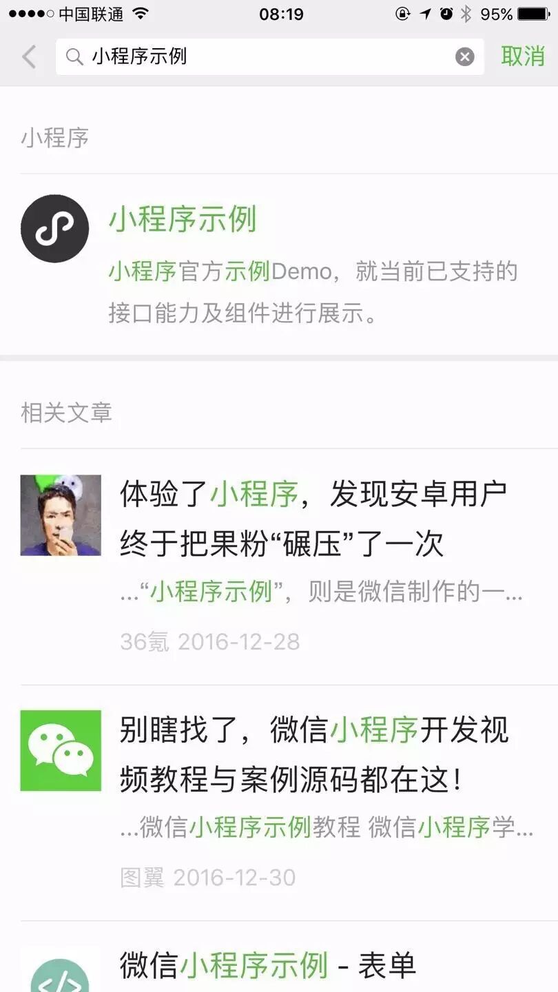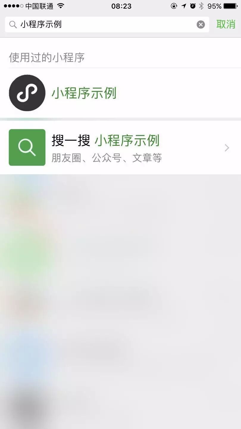 然后搜索。点最下面的:搜一搜 小程序示例 朋友圈、公众号、文章等。