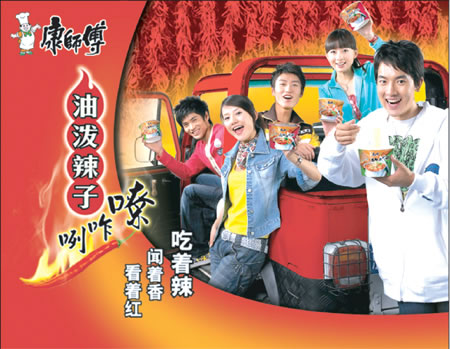 旁白:康师傅“油泼辣子”/ 麻辣牛肉面,麻辣过瘾/香辣牛肉面,香辣入味/这个味嘹咋咧/ 康师傅“ 油泼辣子”。