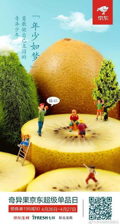 最后还有一组微缩摄影的海报,放大猕猴桃,创建背景,搭建趣味性的场景。